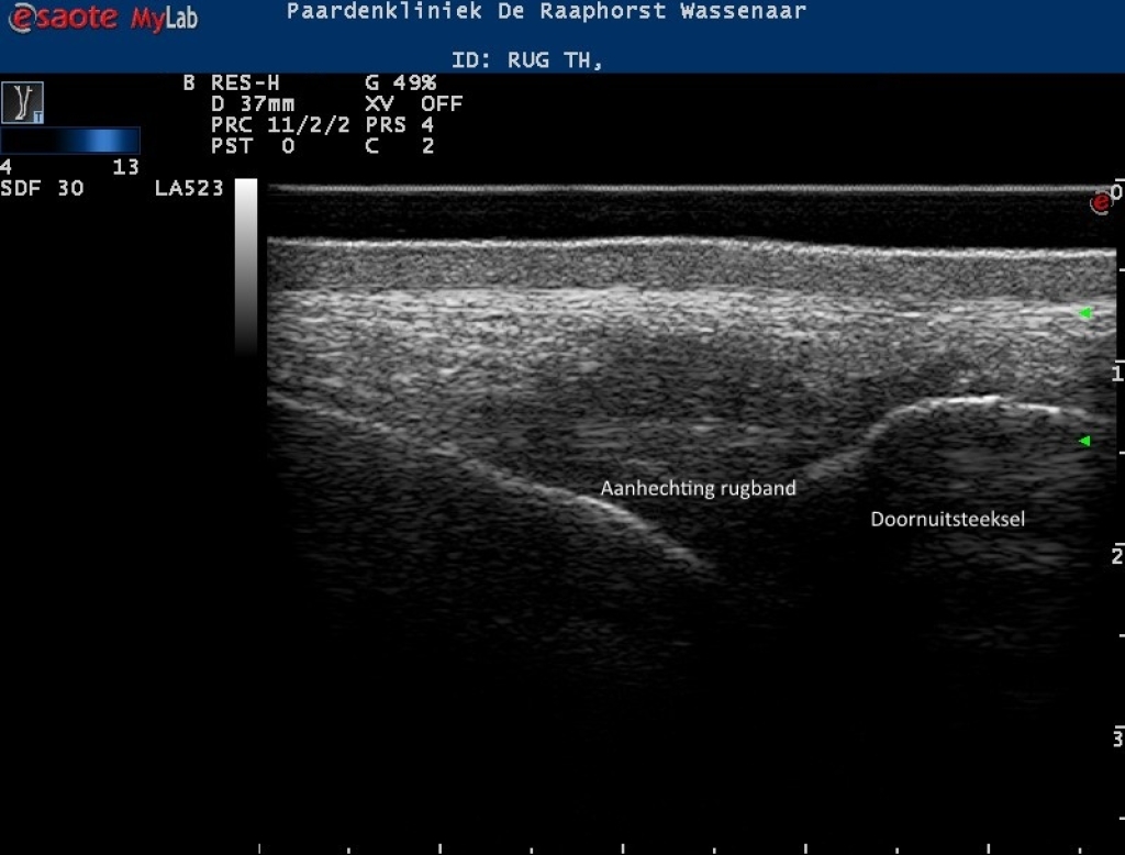 Rechts: Echobeeld van de rugband boven een doornuitsteeksel