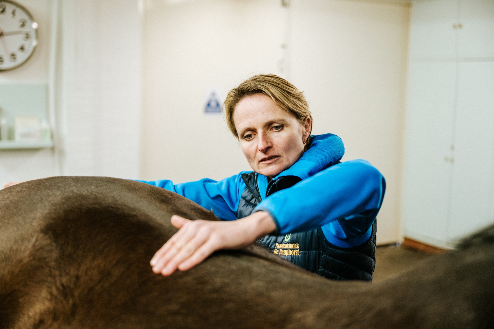 Als we het paard uitgebreid bekeken hebben, zullen we vervolgens de hals, rug en bekken afvoelen. Daarbij letten we op pijnreacties en spierspanning. Verder zullen we ook de beweeglijkheid van de gehele wervelkolom testen. We kijken dan of er sprake is van een beperking in de beweeglijkheid of dat bepaalde bewegingen pijnlijk zijn. Aan de hand van de bevindingen van het klinische onderzoek en de manier van lopen kunnen we het probleemgebied identificeren. De volgende stap is om de exacte oorzaak van de klachten te diagnosticeren met behulp van beeldvormende technieken zoals röntgenfoto’s en echografisch onderzoek.